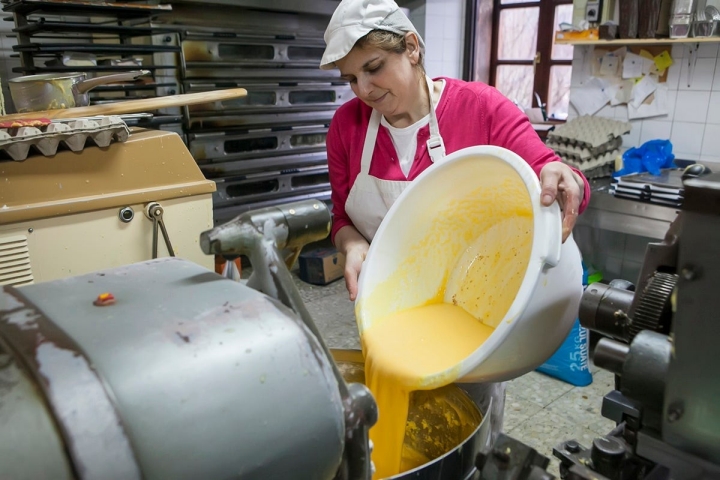 Antes ha mezclado la harina y el huevo a batir en la máquina que ya montó Etelvina y "las proporciones de cada componente tienen pocas variables de las que exige la denominación de origen. Luego, la calidad de esos componentes influye. Y los conservantes".