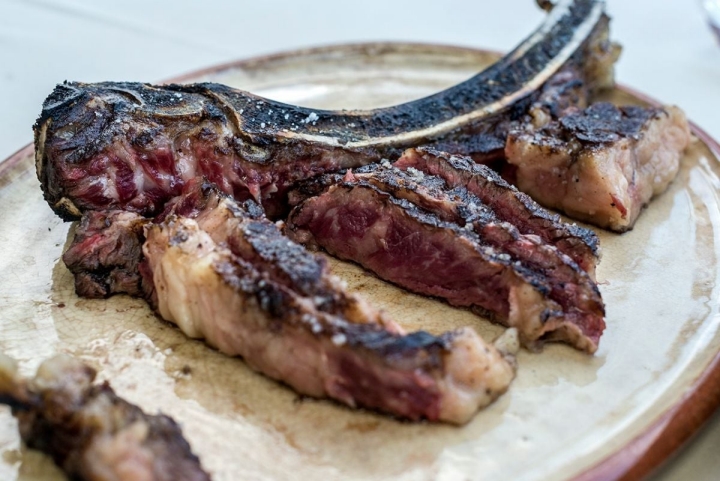 Con su leche, entre cinco y ocho litros al día, elabora su propia mozarella, no más grande de lo que cabe en el puño de una mano, delicada y ligeramente ahumada, tercer paso de un menú en el que el producto a la brasa es el rey.
