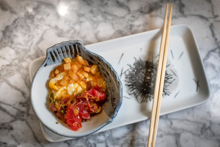 La vajilla, con trazos de erizos, gambas y chipirones dibujados por el artista Abraham Lacalle -el mismo que ha diseñado el logo del restaurante-, sirven de lienzo para los siguientes pases de nigiris: el de vieira con jugo de yuzu, el de salmón, kimchi y lima tostada “con toques picantes, ahumados y cítricos” o el de ventresca de atún rojo flambeado cuya grasa carameliza bajo la llama. “Este nigiri se nos ocurrió pensando en una crema catalana”, dice el veterano sushiman con su amplia sonrisa.