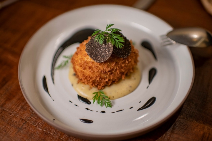 Luego llegan otros platos estrella como son las patatas a la importancia, que "hacemos en una marinera de azafrán y acompañamos con unas cocochas de merluza y colas de gambas de Huelva, ponemos también las patitas de las gambas crujientes y unos puntitos de una crema de guisantes, con sus brotes”, explica la jefa de sala, que ya estaba con él en 'Cepa 21' y es palentina. “También el jefe de cocina, Rubén Franco, es de aquí, de Osorno y llevamos años con Alberto”. Marta detalla el huevo con bechamel trufado, con una base una parmentier trufada, una pincelada de nata tintada y encima el huevo a baja temperatura, envuelto en bechamel y rebozado en panko. Para terminar, añaden unas perlas de trufa.