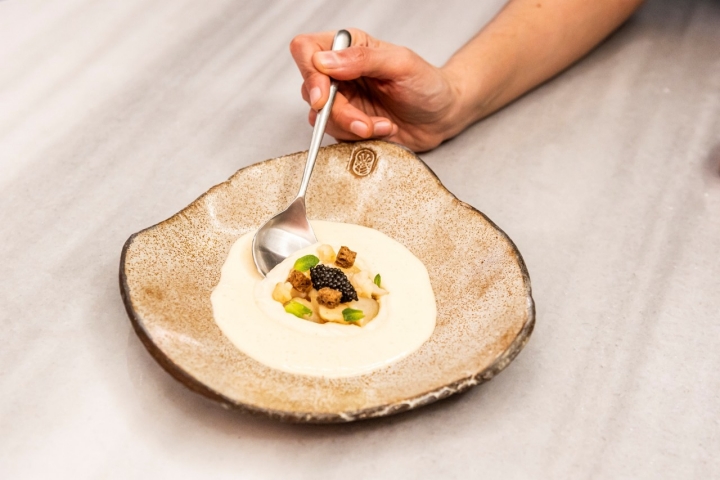 La artesanía del ceramista de Navarrete Toño Naharro se luce especialmente en los caparrones. En estas legumbres de Anguiano al oloroso sobresale el lomo curado de jabalí y el aire de hinojo marino en lugar de la típica guindilla es la representación de Mallorca, el tercer punto clave de esta narración. Y para terminar los pases salados, el sabor a sarmiento y el limón encurtido en la muselina de castañas asadas imprime personalidad en la pieza de paloma torcaz.