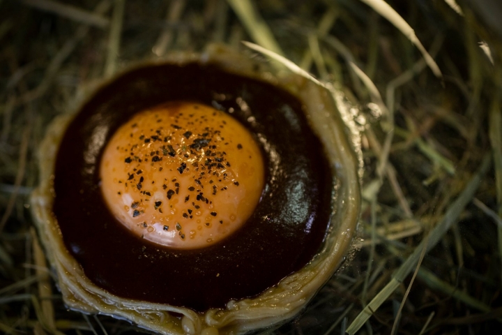 Continuamos con el biscuit de helado de foie con manzana, que es sabroso a la par que refrescante y que es uno de sus platos fetiche -está inspirado en la milhoja de Berasategui-. Más producto: la alcachofa con jugo de codillo ibérico, que terminan en mesa con trufa negra, es otra oda a la temporada en forma de plato efímero. “Escogemos platos de la cocina tradicional de la zona y combinamos nuestra memoria gustativa con nuevas tendencias e interpretaciones para crear registros diferentes”.