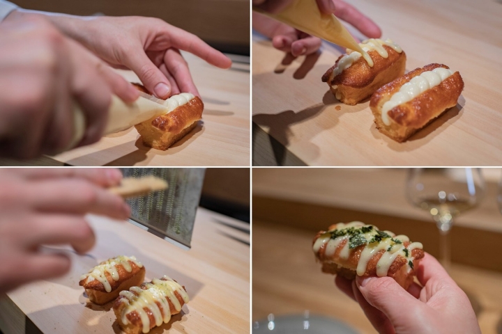El siguiente pase es toda una sorpresa: castañetas de cerdo ibérico confitadas en grasa de jamón y fritas en katakuri -almidón de patata-, acompañadas de curry japonés, salsa de sésamo y corujas para refrescar. "En Japón se come mucha casquería, no al nivel de España, pero bastante. Por ejemplo del pollo, cocinan hasta los cartígalos; y del cerdo ibérico se llevan todo", desvela David, enamorado de la cocina japonesa desde hace más de 20 años. Después llega el misho rojo que prepara con un caldo de tuétano, dashi, parmesano, cebollino y trufa. Todo en vajilla japonesa. "Es una sopa con mucha fuerza y mucha proteína. El parmesano y la trufa potencian mucho los aromas".