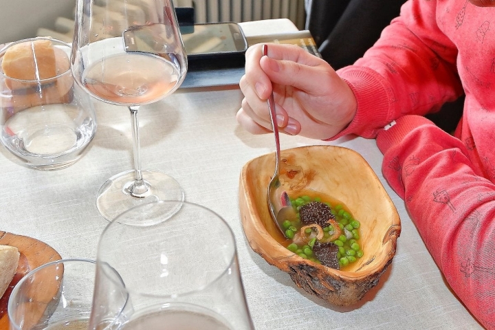 Durante el invierno, las setas tienen que compartir su protagonismo con la trufa negra soriana, delicatessen que crece bajo el suelo y que es un auténtico diamante negro en la alta cocina. En la sopa de cocido, "con muchos toques de la abuela Luciana", los fideos en vez de pasta son de tuber melanosporum, y acompañan a una gyoza rellena con el huevo duro, la ternera, el jamón, el espinazo..., sumergido todo en un caldo que rematan con un chorrito de manzanilla Romate, atrufada desde diciembre. Los guisantes del Maresme también están trufados, con una panceta soriana presentada en dos cocciones y todo regado con un caldo de gamba blanca también del Mediterráneo.