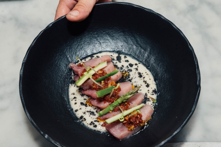 La terraza está llena y Miguel comienza a ensamblar con mucho cuidado un plato de bonito semigraso con crema de espárragos blancos, tierra de aceituna negra Kalamata, tartar de tomate seco con almendra y germinados de espárrago triguero encurtido por encima. Es uno de los pescados favoritos de José. "El bonito es del Mar Menor y nos lo salan menos de lo que es habitual aquí, es más meloso en boca. La salsa de espárragos la hacemos de lata. Lo probamos con espárragos frescos y no quedó igual de rica".