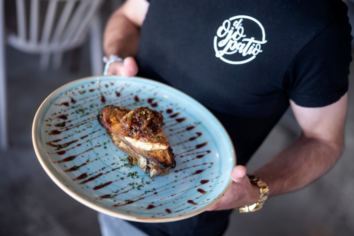 Además de tapas, ‘El ojo patio’ cuenta con una amplia carta que incluye platos a compartir -como un timbal de berenjena y mousse de pato- además de carnes, pescados, arroces y ensaladas. Para el postre, unas torrijas con helado de turrón o un brownie sin gluten ponen el punto final al menú.