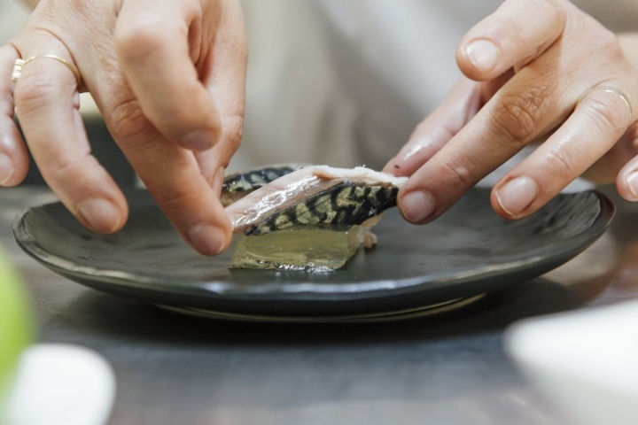PASO 4: Para montar los platos se hacen cuatro cortes de gelatina, se ponen encima cuatro cortes de caballa y se rocían los lomos con la reducción de aceite de cava. Así se consigue el sabor de la gelatina en la base, donde se asienta la caballa, y también en el cielo, con esa fina capa que le da brillo.