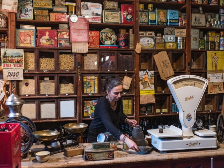 En donde sí parece que se ha detenido el reloj es en el antiguo ultramarinos, “que ya solo utilizamos como almacén para el bar y el hostal, pues no nos da la vida para mantenerla como tienda”, reconoce Mireia. Ahí permanece el mostrador modernista donde despachaban, los cajones de madera donde se guardaban los productos a granel, molinillos de café y pimienta, las antiguas balanzas Berkel, botellas cubiertas por el polvo o productos con las etiquetas envejecidas.