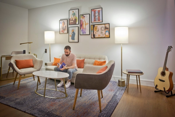 Al fondo, dos salas privadas conectadas con el vestíbulo, bautizadas como Virginia y Woolf, en honor a la autora de Una habitación propia, continúan con el estilo del lobby, aunque con tonos más anaranjados y presencia de obras de arte. A su lado, se instaló una biblioteca, recreando el espíritu del barrio de las Letras, que se ha llenado de ejemplares en colaboración con la editorial Zenda, de Arturo Pérez-Reverte.