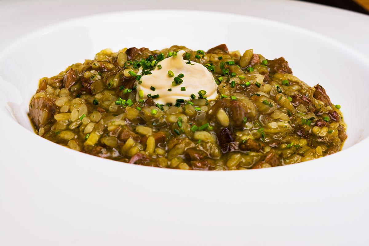 El chef, curtido con primeros espadas de los fogones como Arzak, Santamaría, Aduriz, Berasategui y Alija, entre otros, ilumina la despensa manchega: canelones de civet de caza, toffee de cebolla y espuma de bechamel de boletus; albóndigas de ibérico estofadas en pepitoria de avellanas…