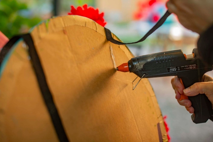 18. Cuando estén secas solo faltará poner los tirantes de cinta negra que unirán las dos mitades y nos permitirán llevar puesto el disfraz. Coge una mitad, y en la parte de atrás (la base circular de cartón), pega con la pistola de silicona dos de las cintas calculando que entre ellas haya una separación de 25 cm. Y después dejando 40 cm de cinta pega los extremos a la otra pieza de cartón, guardando también la separación de 25 cm. Ya tienes los tirantes que irán sobre los hombros montados.