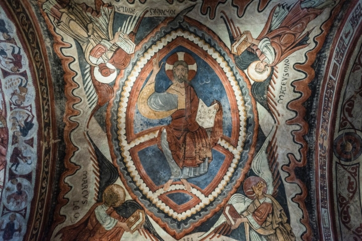 Llegamos a una de las pinturas centrales, que mejor ha conservado los pigmentos y trazos sobre el blanco de la cal. Se trata del Pantocrátor, "un Dios Todopoderoso, en una cósmica visión". En el centro, enmarcado en un cerco oval conocido como mandorla (almendra mística), Cristo bendice con la mano derecha y en la izquierda sostiene un libro abierto sobre el que está escrito, en latín, el mensaje EGO SUM LUX MUNDI (Soy la luz del mundo). Le rodean, en las cuatro esquinas, los evangelistas, representados por sus respectivos animales místicos. "Es una escena muy potente, que gobierna sobre todo el Panteón y bendice el lecho eterno de los reyes", señala la guía.