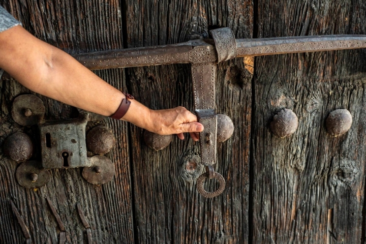 Con la boca que sigue abierta desde la belleza del pórtico y luego ante las pinturas, se pasa hasta la sacristía y el arcón donde se guardan unas láminas sobre tela "que son el Credo", puntualiza Pilar en apoyo de Consuelo, al oír los labios curvados en un bobo "Ohhh" que se diluye cuando gira el curioso esquilón con campanillas que aguarda en una esquina. "Cuando yo era pequeña, las láminas del Credo colgaban una tras otra y servían para enseñar el catecismo a quienes no sabían leer ni escribir", cuenta. Un soplo de tiempos muy pasados envuelve todo, acompañado por las motas de polvo que entran en la torre durante la subida al campanario, donde la estructura de madera y las campanas lucen cuidadas, pese a las palomas.