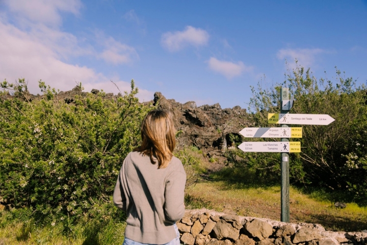 Partiendo del pueblo y subiendo por la Pista Agrícola de los Baldíos, se llega hasta la famosa ruta de los almendros. Ya arriba, una cruz marca el inicio de la ruta del almendro en flor, los almendreros, como se conocen en Tenerife. Kristen Martin muestra el paraje con brillo en los ojos. Oriunda de allí, conoce estos lugares desde pequeñita. “Se puede hacer una ruta larga desde detrás del Ayuntamiento, pero donde se concentran los almendros es desde aquí hasta allí arriba, hasta la Reserva Natural de El Chinyero. Esta ruta larga puede llevar cuatro o cinco horitas, o también se puede hacer una circular, bajando por la zona de Las Manchas, tierra fértil que no fue alcanzada por la lava, ya que esta paró justo aquí. Este es un entorno que tiene mucha lava y mucho picón, el material que sale cuando se empieza a degradar la lava”.